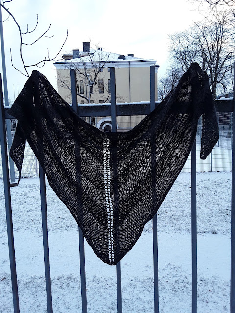 This is not my only favourite shawl but nevertheless. It is perfectly suitable for cold seasons. It had been snowing in the morning and I put on my winter coat with this shawl. Made in the end of 2013.